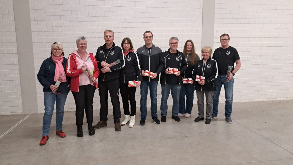 Die 10 besten Einzelschützen konnten sich über Geldgewinne bzw. über eine Mettwurst freuen: (von links) Rita Stein, Antje Pirngruber, Johann Pollmann, Cornelia Pollmann-Mietz, Ronny Feddermann, Achim Postert, Bianca Behr, Brigitte Bayer und Göke Göken. Auf dem Foto fehlt Manfrred Wollenberg.